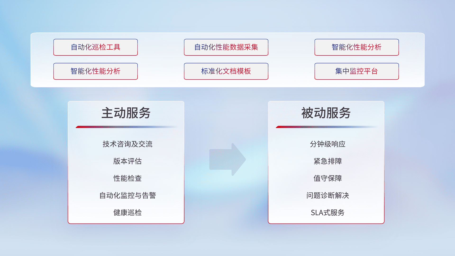 智能化工具和标准化文档,,,,保障服务质量,,,,提供主动服务(包含技术咨询、、、版本评估、、、、性能检查、、、自动化监控与告警、、、健康巡检)和被动服务包含(分钟级响应、、、紧急排障、、、、值守保障、、、、问题诊断解决、、、SLA服务)。。