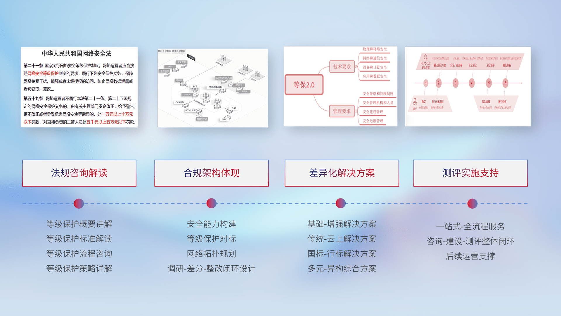 通过专业的法律咨询解读、、、合规架构体现、、、、差异化解决方案、、测试实施支持等服务,,,为客户量身打造等保合规体系。。。